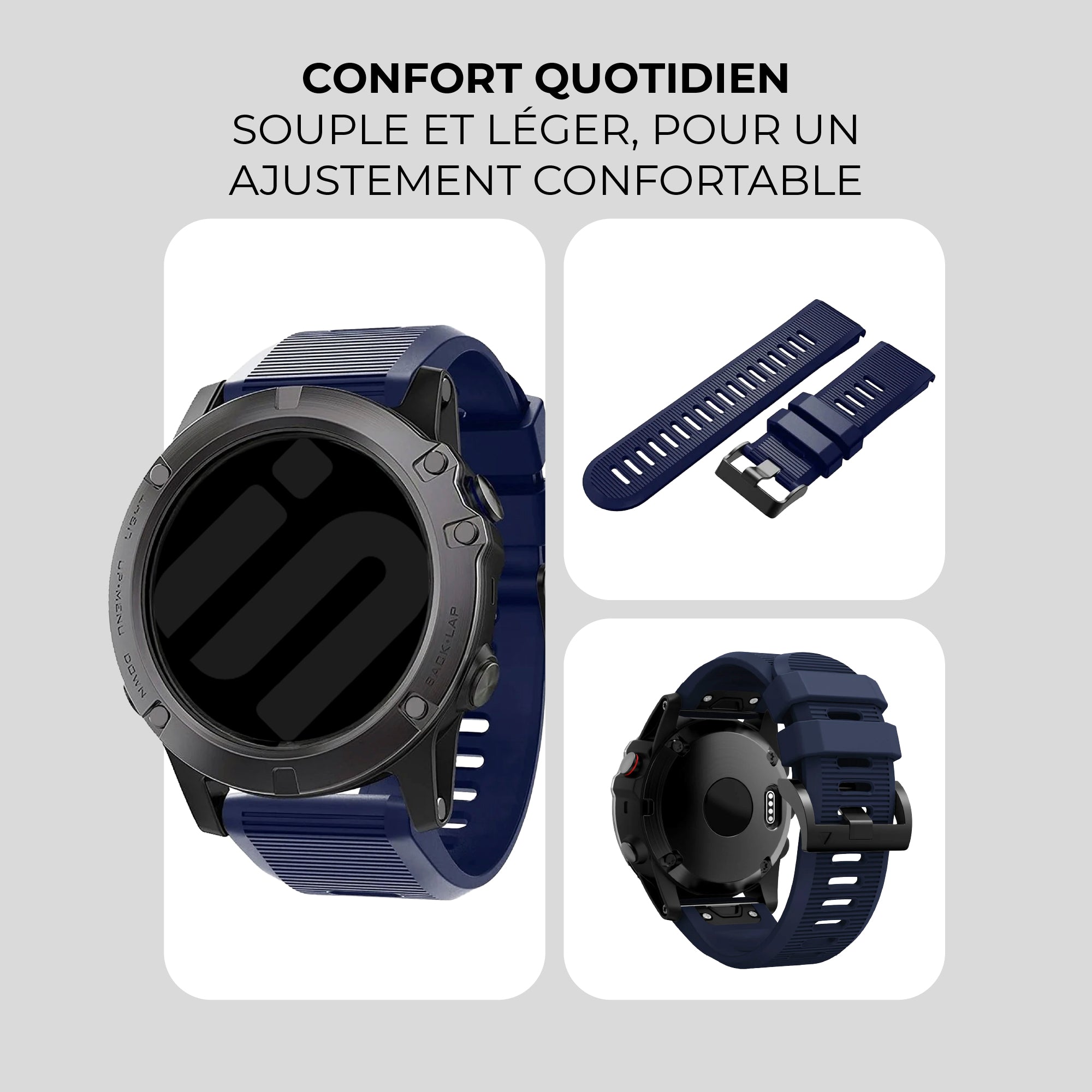 Les bracelets en silicone du Garmin D2 Delta PX sont parfaits pour un usage quotidien, mais aussi très adaptés au sport. Le silicone, à la fois souple et agréable au toucher, garantit un port confortable sans irritations. Le choix de couleurs est large.