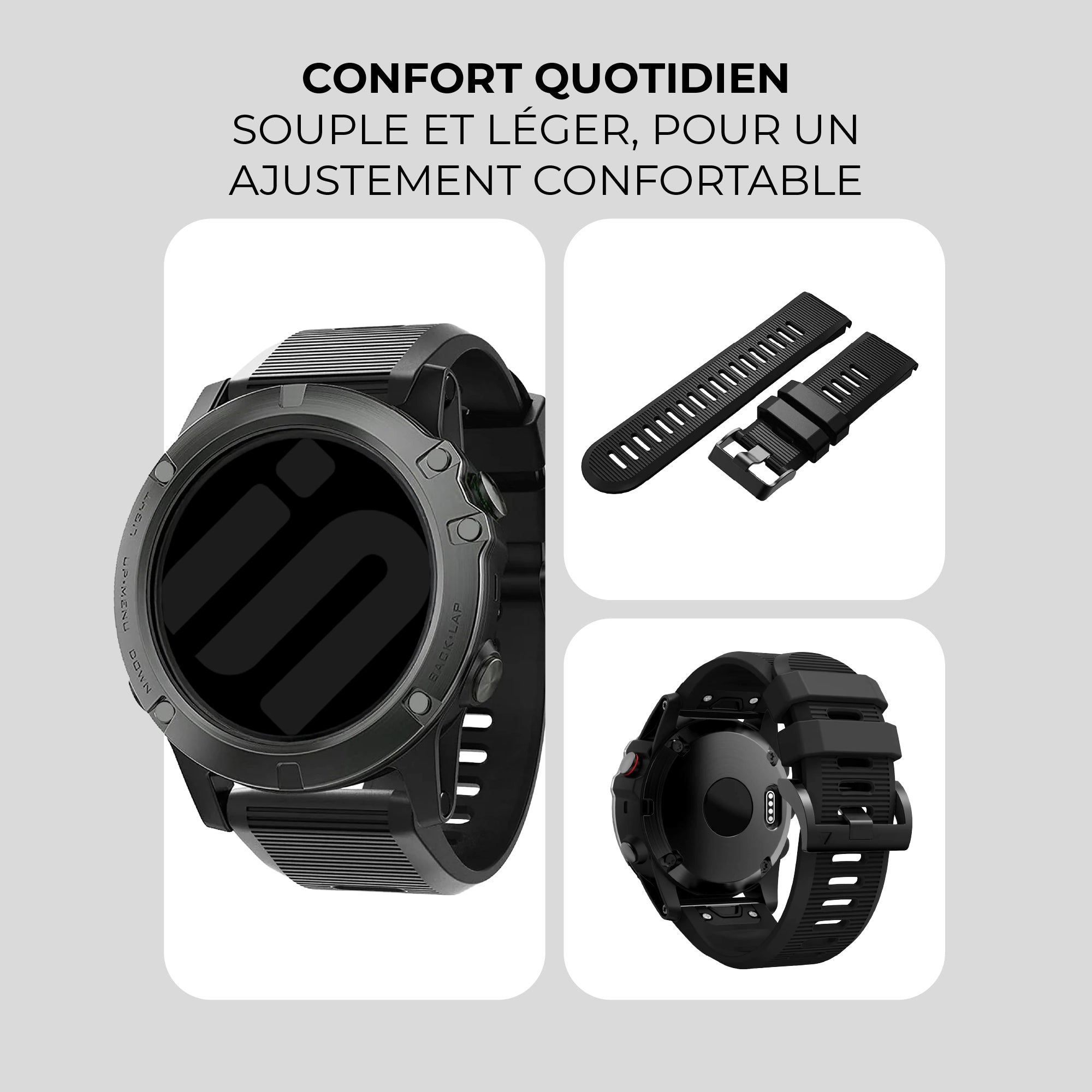 Les bracelets en silicone du Garmin D2 Delta PX sont parfaits pour un usage quotidien, mais aussi très adaptés au sport. Le silicone, à la fois souple et agréable au toucher, garantit un port confortable sans irritations. Le choix de couleurs est large.