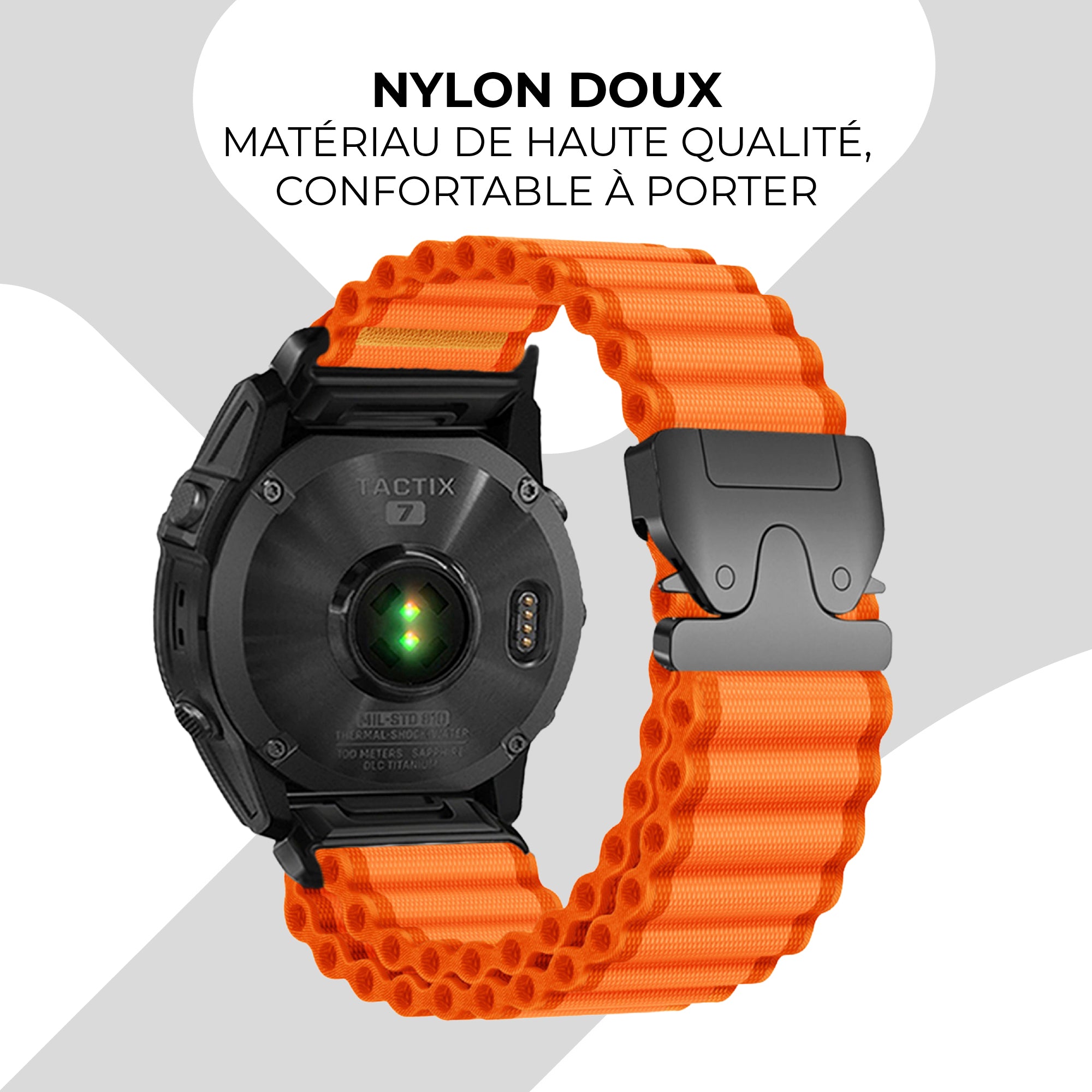 Les bracelets en nylon peuvent sembler moins formels qu’un bracelet en cuir ou en métal. Ils sont étanches, mais doivent sécher après le lavage ou la baignade.